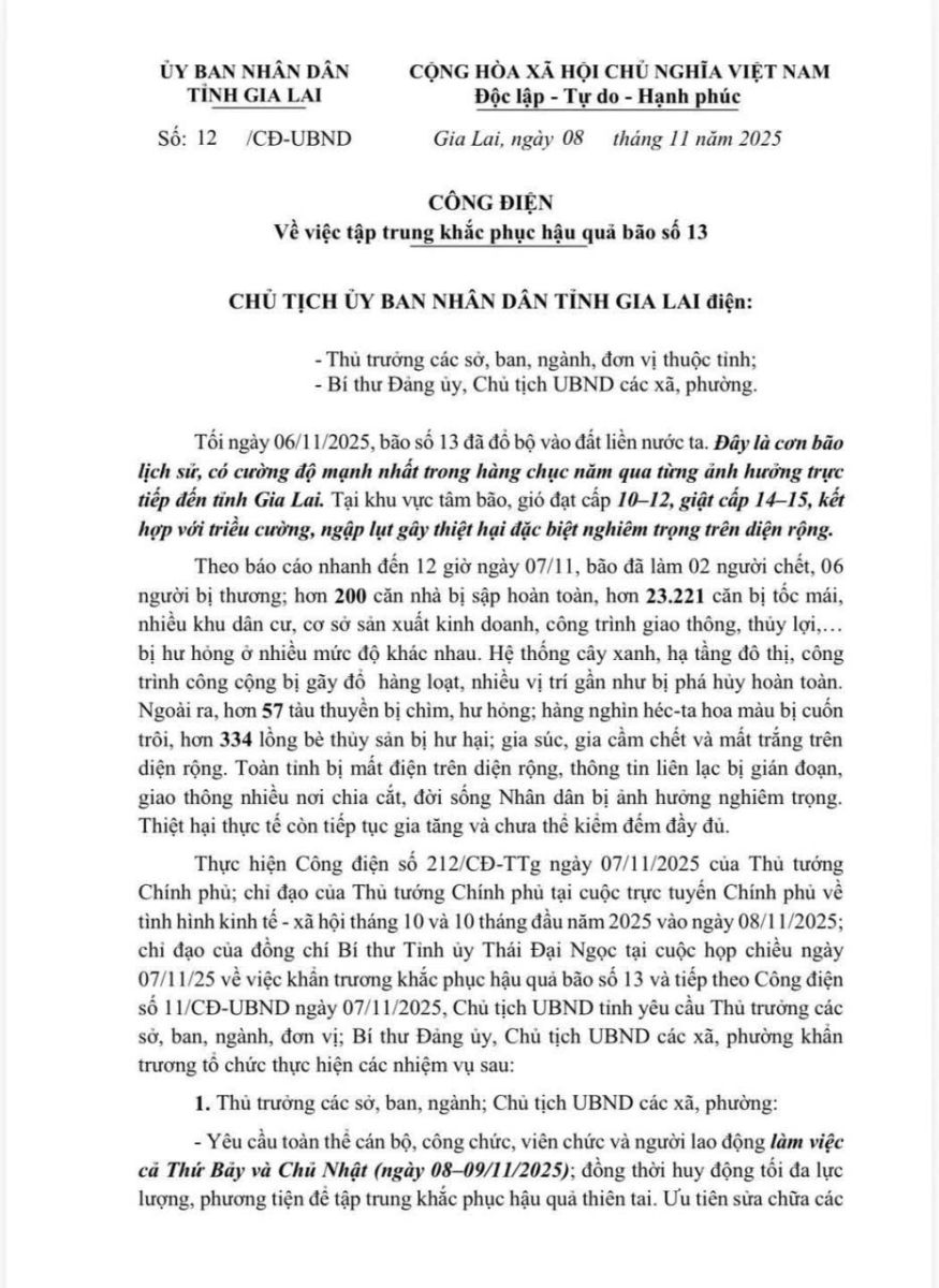 Thứ bảy, 08/11/2025 | 18:28 A- A A+ | Công điện của Chủ tịch UBND tỉnh Gia Lai yêu cầu tập trung khắc phục hậu quả bão số 13. Chia sẻ Đọc bài Lưu Công điện số 12/CĐ-UBND ngày 08/11/2025