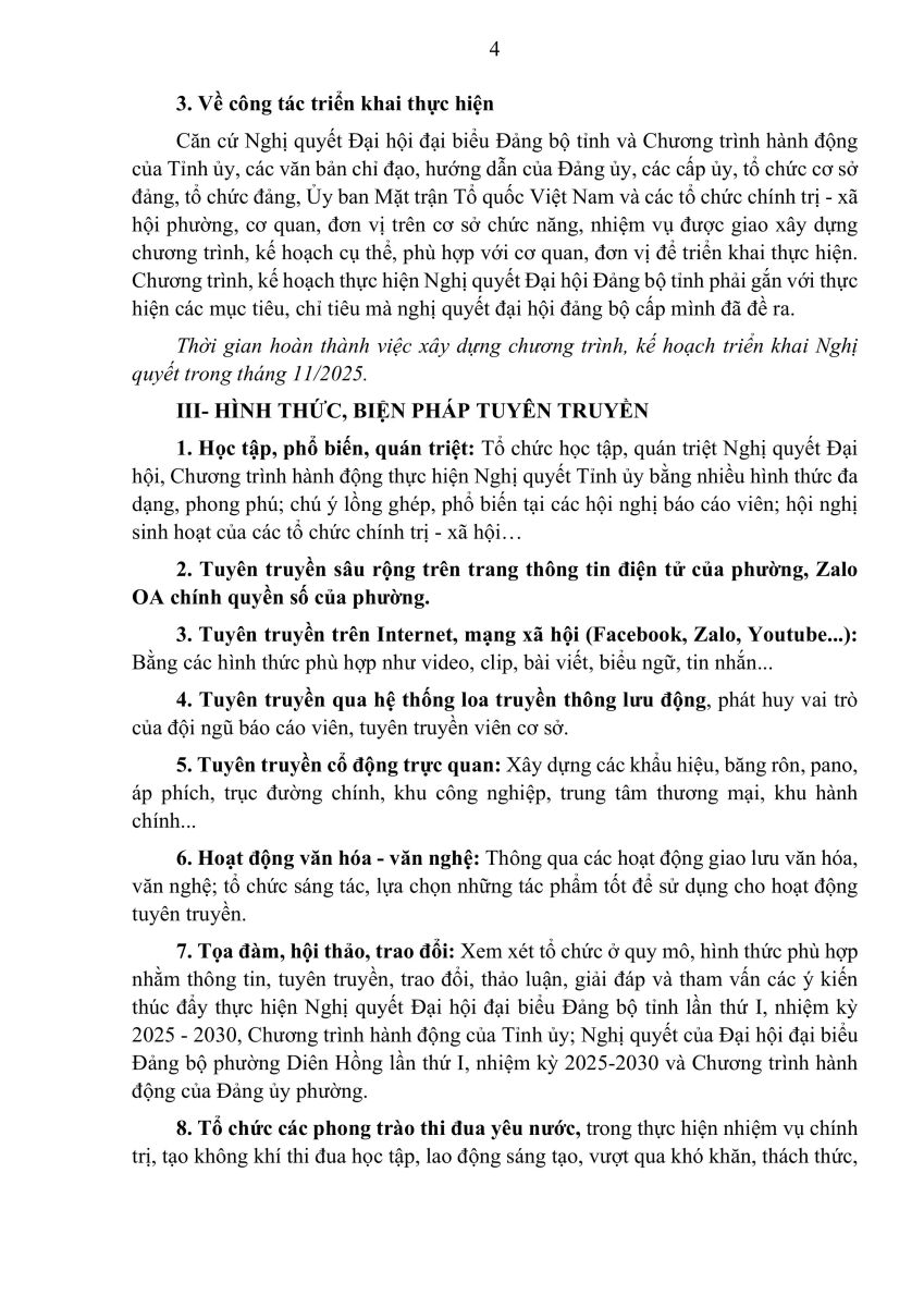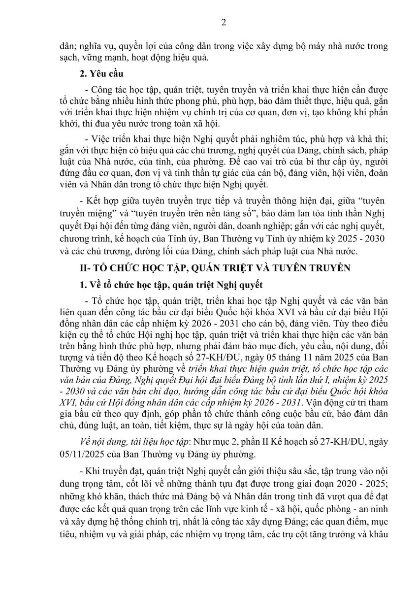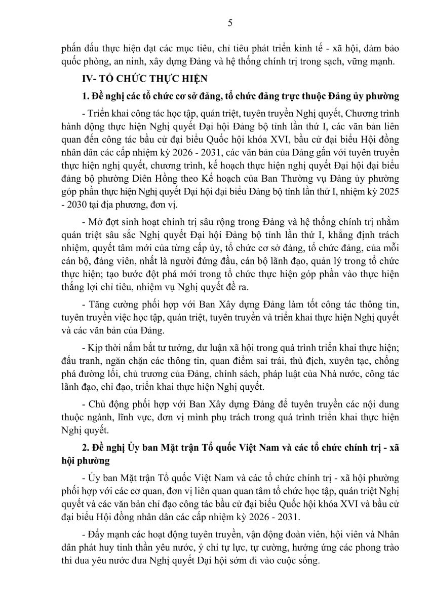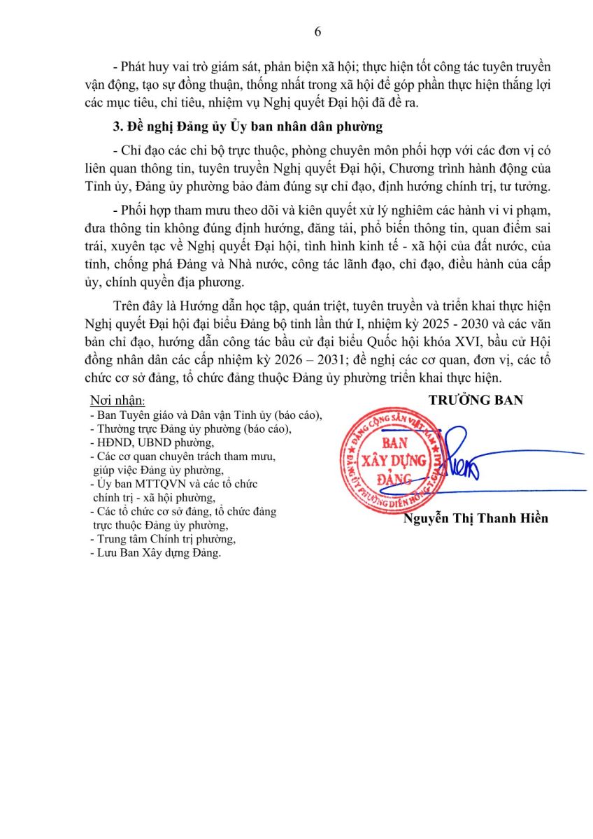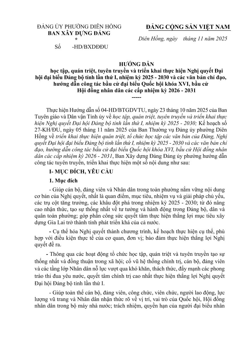 Hướng dẫn số 01-HD/BXDĐĐU ngày 07/11/2025 của Ban Xây dựng đảng Đảng ủy phường Diên Hồng về hướng dẫn học tập, quán triệt, tuyên truyền và triển khai thực hiện Nghị quyết Đại hội đại biểu Đảng bộ tỉnh lần thứ I, nhiệm kỳ 2025 - 2030 và các văn bản chỉ đạo, hướng dẫn công tác bầu cử đại biểu Quốc hội khóa XVI, bầu cử Hội đồng nhân dân các cấp nhiệm kỳ 2026 - 2031.