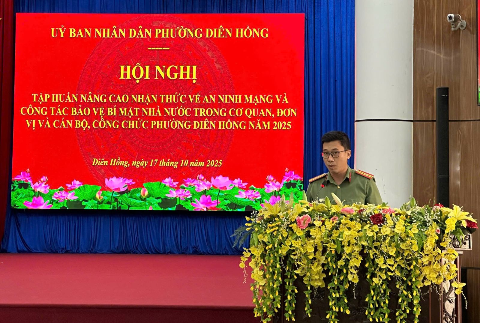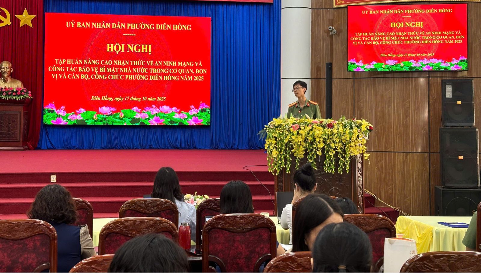 Thực hiện Thông báo số 1555/TB-CAT-PA05 ngày 14/8/2025 của Công an tỉnh Gia Lai về việc khắc phục tồn tại, hạn chế trong công tác bảo đảm an ninh mạng và an toàn thông tin, sáng ngày 17/10/2025, UBND phường Diên Hồng tổ chức Hội nghị tập huấn, nâng cao nhận thức về an ninh mạng và công tác bảo vệ bí mật nhà nước trong cơ quan, đơn vị và cán bộ, công chức phường năm 2025.