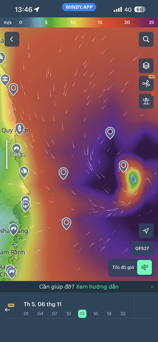 Theo bản tin nhanh của Trung tâm Dự báo khí tượng thủy văn quốc gia, lúc 13 giờ ngày 6-11, vị trí tâm bão vào khoảng 13.3 độ Vĩ Bắc; 110.8 độ Kinh Đông, cách Quy Nhơn (tỉnh Gia Lai) khoảng 190 km về phía Đông Đông Nam. Sức gió mạnh nhất cấp 15 (167-183km/h), giật trên cấp 17.