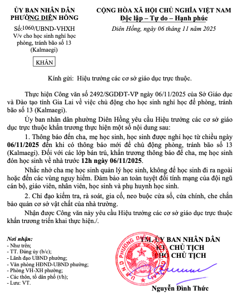 Thứ năm, 06/11/2025 | 13:24 A- A A+ | Công văn (khẩn) của UBND phường Diên Hồng về việc cho học sinh nghỉ học phòng chống bão số 13 (Kalmaegi) Chia sẻ Đọc bài Lưu Tập tin đính kèm Trình duyệt không hỗ trợ iframe.