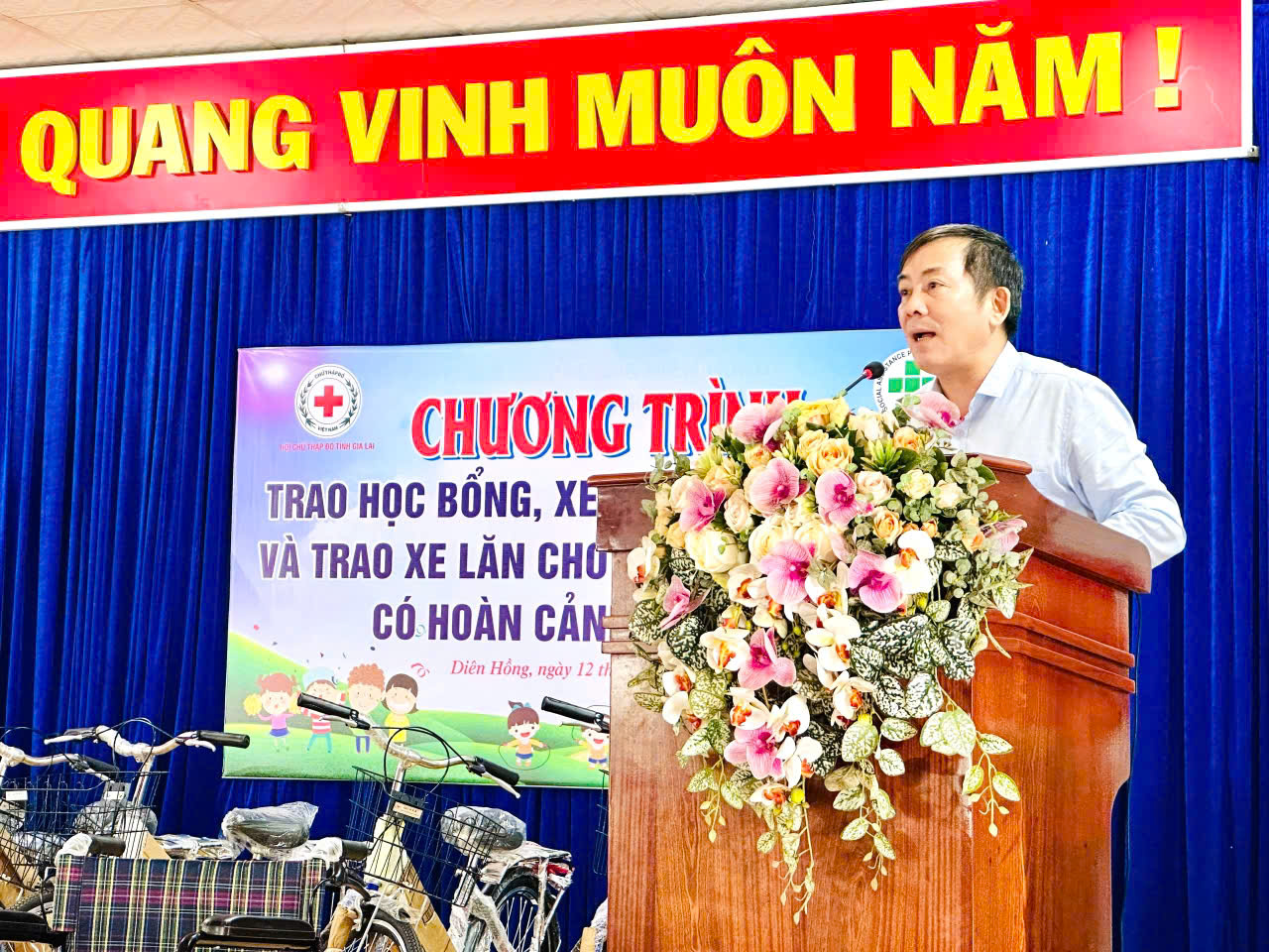 Phát biểu tại chương trình, ông Nguyễn Đình Thức - Ủy viên BTV Đảng ủy - Phó Chủ tịch UBND phường đã phát biểu cảm ơn đến tổ chức SAP-VN, Hội chữ thập đỏ tỉnh Gia Lai đã quan tâm, chia sẻ những khó khăn đến các đối tượng học sinh nghèo, khó khăn, người khuyết tật trên địa bàn các phường nói chung, phường Diên Hồng nói riêng, giúp họ khắc phục một phần khó khăn, vươn lên trong cuộc sống.