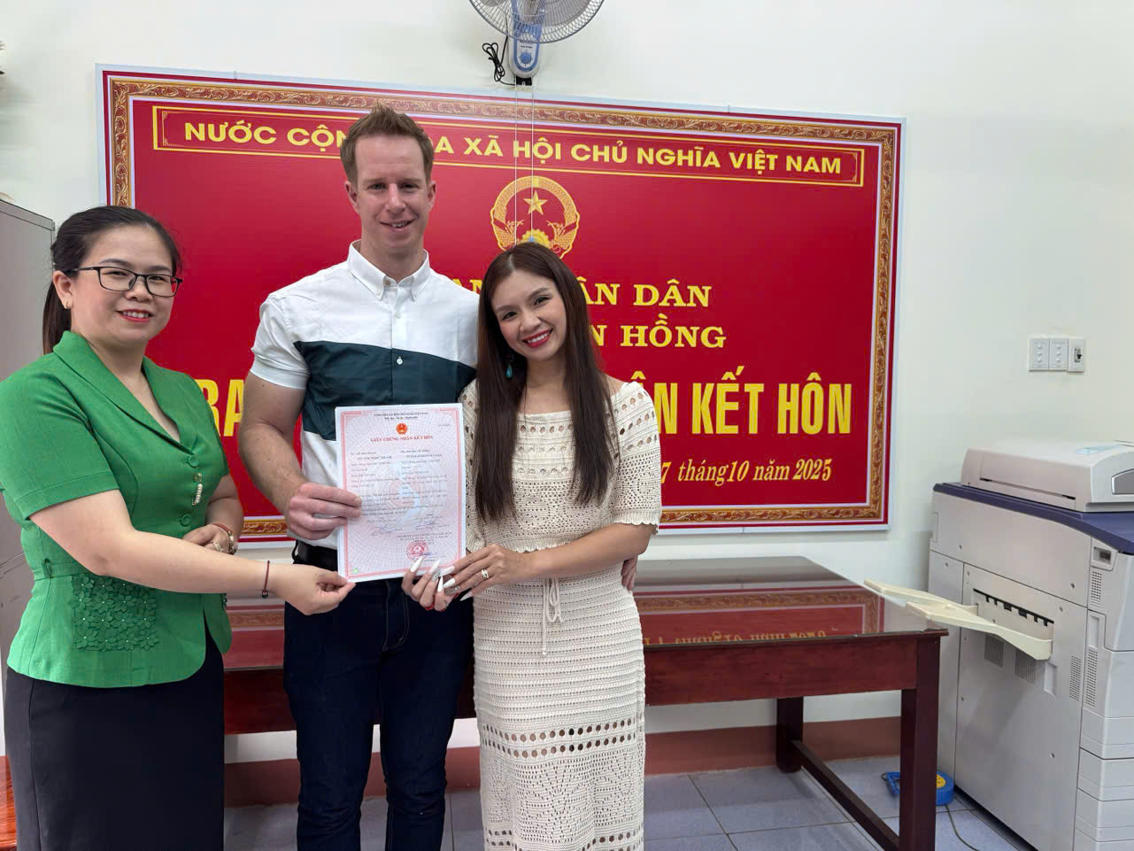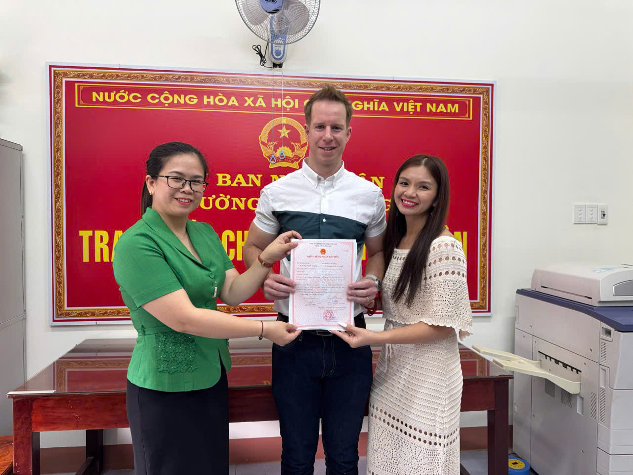 Văn phòng HĐND và UBND phường đã trao giấy chứng nhận đăng ký kết hôn, chúc mừng chị Bùi Thị Ngọc Thanh và anh PETER JOSEPH WATERS đã chính thức trở thành vợ chồng theo quy định của pháp luật Việt Nam, gửi lời chúc mừng hạnh phúc đến đôi vợ chồng luôn yêu thương, gắn bó và xây dựng, gìn giữ hạnh phúc gia đình cũng như những truyền thống tốt đẹp của đất nước Việt Nam và đất nước Anh.
